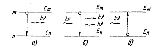 Пусть рассматриваемая нами квантовая система находится в равновесном состоянии. Тогда даже при отсутствии внешнего электромагнитного поля частица, занимающая более высокий энергетический уровень m, может перейти на более низкий энергетический уровень n, излучив при этом квант энергии hυ=Еm-Еn. Такое излучение носит название спонтанного излучения (рис. 6.1, а). Если вероятность перехода между уровнями m→n в единицу времени обозначить Amn„ (коэффициент Эйнштейна для спонтанного излучения), то мощность спонтанного излучения определяется как