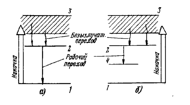 В трехуровневой системе (рис. 6.2, а) часть частиц активной среды за счет энергии накачки переводится из основного состояния 1 в широкую полосу 3, затем эти частицы безызлучательно переходят на уровень 2. Уровень 2 является метастабильным, т. е. таким возбужденным уровнем энергии частицы, с которого запрещен излучательный квантовый переход на более низкие уровни энергии. Благодаря этому время жизни на этом уровне велико по сравнению с обычными временами жизни возбужденных уровней, что позволяет накапливаться частицам на этом уровне. Если мощность накачки достаточна, то между уровнем 2 и основным уровнем 1 будет создана инверсия населенностей. Недостатком этой системы является то, что для создания инверсии населенностей более половины частиц активной среды должно быть переведено из основного состояния в состояние 2. Для этого требуется большая энергия накачки.