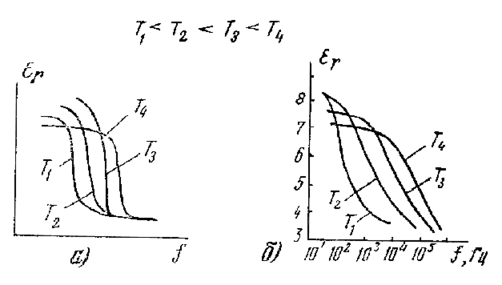 На рис. 7.2.6 приведена зависимость ε от частоты для полярных диэлектриков при разных температурах: а — теоретическая, б —для поливинилацетата.