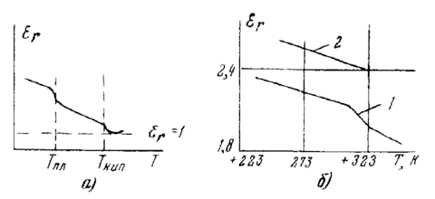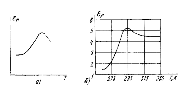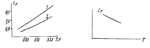 повышением температуры ослабевают межмолекулярные взаимодействия, растет интенсивность процессов поляризации, а, следовательно, и диэлектрическая проницаемость.