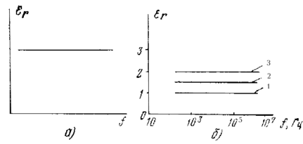 При рассмотрении зависимости величины ε от частоты, необходимо принять во внимание основные виды поляризации, которые возникают в том или ином материале. Если в диэлектрике наблюдаются только, электронный и ионный механизмы поляризации, то, поскольку времена релаксации этих видов поляризации очень малы, ε практически не зависит от частоты. На рис. 7.2.5 приведена зависимость ε от частоты для неполярных диэлектриков: а — теоретическая, б — политетрафторэтилена (кривая 1), полистирола (кривая 2), полидихлорстирола (кривая 3).
