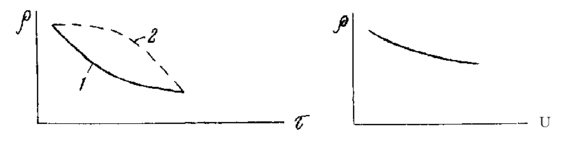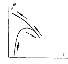 обственная электропроводность твердых тел и изменение ее от температуры определяется структурой вещества и его составом. Большое влияние па электропроводность технических диэлектриков оказывает влага, ничтожное количество которой, образует нити или пленки по толщине изоляции, которые могут пронизывать весь промежуток между электродами, что приведет к резкому ухудшению электрических свойств изоляции. Если же имеется пористый материал, который содержит растворимые в воде примеси, создающие электролиты с высокой проводимостью, то зависимость удельного сопротивления р от температуры при нагревании и охлаждении образца будет иметь вид кривой, представленный на рис. 7.3.3.
