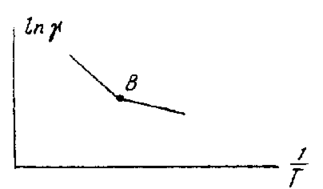 где А1 и А2 — коэффициенты, постоянные для данного материала; ΔEпр — энергия активации примесей. В широком интервале температур зависимость логарифма проводимости от обратной температуры представлена на рис. 7.3.2 в виде двух прямолинейных участков с различными значениями угла наклона к оси абсцисс. В области температур до точки В электропроводность обусловлена в основном ионами примесей, выше точки В электропроводность определяется собственными носителями заряда. Собственная электропроводность не зависит от примесей, хорошо воспроизводима и является физическим параметром данного материала. Температура, при которой происходит излом зависимости In γ = f(1/Т), сильно зависит от степени чистоты и совершенства материала. По наклонам участков прямых можно оцепить энергию активации носителей заряда и их природу.