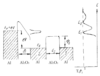 В данной системе реализуется возможность взаимодействия «горячих» электронов, инжектируемых через первый барьер системой уровней резонансного пропускания, формирующейся над вторым барьером, вследствие того, что энергия пика «горячих» электронов прямо пропорциональна напряжению, приложенному к первому барьеру. При монотонном увеличении напряжения на первом барьере ток через второй барьер будет модулироваться в соответствии с поведением коэффициента прозрачности второго барьера. На основе таких структур осуществляется генерация в радиодиапазоне.