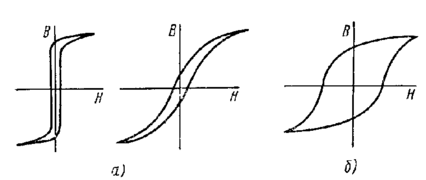 Рис. 9.9. Петли гистерезиса для, магнитномягких (а) и для магнитнотвердых (б) материалов