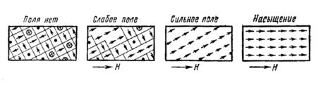 Магнитное насыщение заканчивается тогда, когда рост доменов прекращается и магнитные моменты всех спонтанно намагниченных областей оказываются ориентированными в направлении поля.