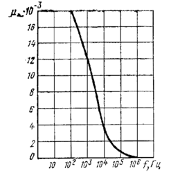 ис 9.6 Зависимость динамической магнитной проницаемости пермаллоя от частоты в слабом поле (Н=0,8 А/м)