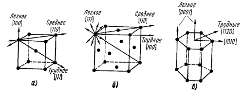 Рис. 9.2 Направления легкого, среднего и трудного намагничивания в монокристаллах: