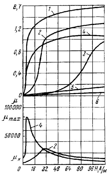 Кривыми намагничивания В =F(H), имеющими качественно общий характер для всех ферромагнетиков, характеризуют протекание процессов намагничивания в ферромагнитных материалах. На рис. 9.5 представлены основные кривые намагничивания некоторых магнитных материалов.
