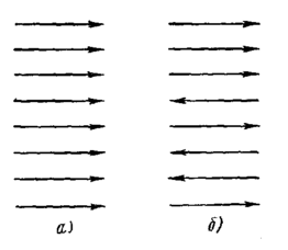 Рис. 9.11. Схематическое изображение направления спиновых моментов в ферромагнетике (а) и ферримагнетике (б)