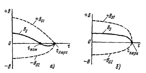 Допустим, что соотношения между ординатами кривых Bs1 и Вs2 при различных температурах для какого-то феррита такие, как показано на рис. 9.12, а. Тогда при некоторой температуре ниже точки Кюри получится компенсация и результирующая индукция насыщения Bs образца станет равной нулю. Эту точку называют точкой компенсации. После достижения точки компенсации у индукции образца меняется знак, затем она становится равной напряженности внешнего поля (которое мало и в масштабе чертежа близко к нулю) в точке Кюри. У различных ферритов точка компенсации может быть, а может и отсутствовать, что видно, например, из рис. 9.12, б.