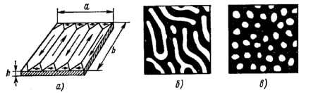 ленки магнитных материалов. Особенностью тонких пленок является то, что при малой толщине их (h<<a,b) направление легкого намагничивания оказывается расположенным в плоскости пленки. Образуются плоские домены, показанные на рис. 9.13, а. Для очень тонких пленок характерна однодоменная структура, для пленок толщиной свыше 10-3—10-2 мм (у различных веществ)— многодоменная, состоящая из длинных узких доменов (шириной от долей микрометров до нескольких микрометров), намагниченных в противоположных направлениях. Под воздействием внешнего поля вся система полос может перемещаться и поворачиваться и ее используют как управляемую дифракционную решетку для света и ближайшего диапазона волн электромагнитного спектра.
