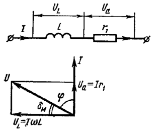 Рис. 9.10. Эквивалентная схема и векторная диаграмма индуктивной катушки с магнитным сердечником
