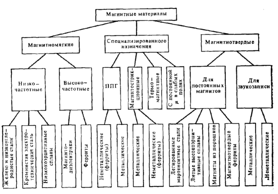 рименяемые в электронной технике магнитные материалы подразделяют, как уже говорилось, на магнитномягкие и магнитнотвердые. Кроме того, техническое применение имеют материалы специализированного назначения: с прямоугольной петлей гистерезиса (ППГ), магнитострикционные и др. Среди магнитномягких материалов могут быть выделены низкочастотные и высокочастотные материалы с повышенным или высоким значением удельного сопротивления. Магнитнотвердые материалы по применению делят на материалы для постоянных магнитов и материалы для записи звука и «его хранения». Более мелкую классификацию осуществляют по родам и видам материалов. На рис. 9.14 дана классификация магнитных материалов, положенная в основу их изучения.