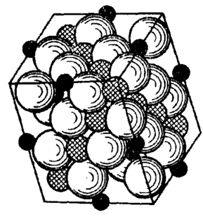 ис. 9.18.Элементарная ячейка шпинели: белые шарики—ионы кислорода; черные-катионы в тетраэдрических положениях; заштрихованные — катионы в октаэдриче-ских положениях