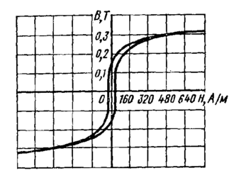 На рис. 9.20 приведена петля гистерезиса феррита с высокой магнитной проницаемостью. Как видно из рисунка, этот феррит имеет максимальную индукцию свыше 0,3 Т. Коэрцитивная сила его невелика — порядка 12 А/м.