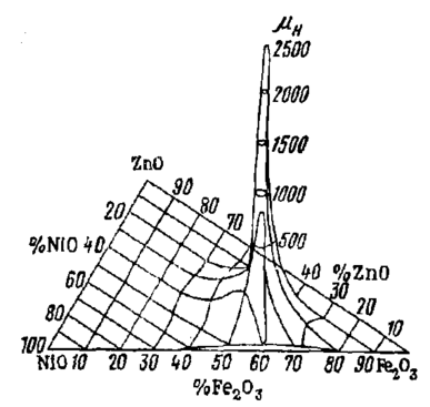 Процентный состав компонентов играет существенную роль в получении тех или иных магнитных свойств материала. На рис. 9.19 в качестве примера показана зависимость начальной магнитной проницаемости никель-цинкового феррита от его состава. Как видно из этого рисунка, высокие значения μн достигаются в довольно узком участке тройной диаграммы.