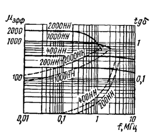 Наиболее распространенная маркировка магнитномягких ферритов следующая. На первом месте стоит численное значение μн, затем идут буквы, определяющие частотный диапазон применения, ограничиваемый сверху значением граничной частоты fгp. Под граничной частотой понимают частоту, при которой начинается быстрый рост тангенса угла потерь феррита и он доходит до значения 0,1. (Другим параметром является критическая частота, при которой начальная магнитная проницаемость снижается ло 0,7 От ее значения в постоянном магнитном поле fкp<fгp). Ферриты для звуковых, ультразвуковых и низких радиочастот для краткости обозначают буквой Н (низкочастотные). Граничная частота их для разных марок может лежать в пределах от 0,1 до 50 МГц. В маркировке высокочастотных ферритов имеются буквы ВЧ, граничная частота их 50—600 МГц. Далее в маркировке магнитномягких ферритов следуют буквы, означающие состав материала: М — марганец-цинковый феррит, Н — никель-цинковый и т.п. В маркировке СВЧ ферритов введены цифровые индексы разновидностей этих материалов.