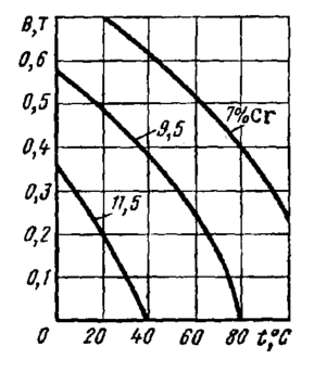 Рис. 9.30 Кривые зависимости магнитной индукции сплавов системы Fe-Ni-Cr с 35% Ni и различным содержанием Сr от температуры в поле с H=8 кА/м