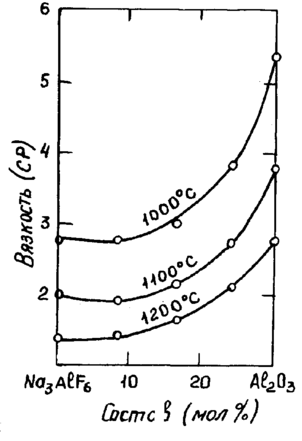ис. 11.1.2.7. Изотермы вязкости для раствора состава:Na3AlF6 / Ba2О3