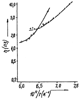 ис. 11.1.2.6. Температурные зависимости вязкости растворов состава: о - 30% Y3Al5O12 в 0,5 BaO x 0,41 Ba2О3 х 0,09 BaF2; + - 30% Y3Al5O12 в 0,41 BaO х 0,41 Ba2О3 х 0.18 BaF2