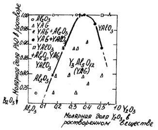 При добавлении Ba2О3 происходит увеличение растворимости (для состава РbО – 0,064 Ba2О3 растворимость ИAГ при 1273 К приблизительно равна 3% вес., а для состава РbО – 0,35 Ba2О3 равна 9,1% вес. при 1233 К, уменьшение температуры. плавления растворителя и его химической агрессивности по отношению к платине, уменьшение летучести свинцовистых растворителей, но одновременно наблюдается увеличение вязкости раствора. Большое количество борного ангидрида, хотя и способствует уменьшению плотности раствора, но ведет к образованию соединения RВО3 где R ион иттрия или редкоземельный ион.