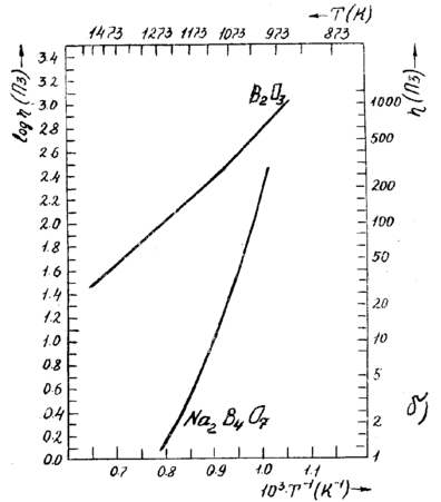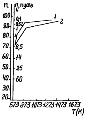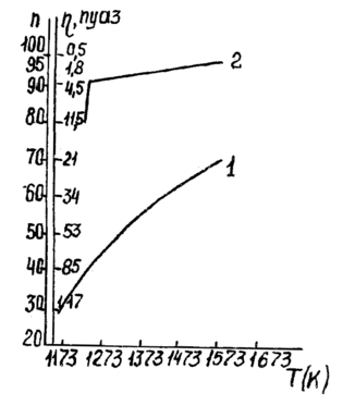 ис.11.1.2.4. Температурные зависимости вязкости растворов состава: (п - относительные показания шкалы прибора); 1 - Ba2О3; 2 78% ВаО х 22% Ba2О3