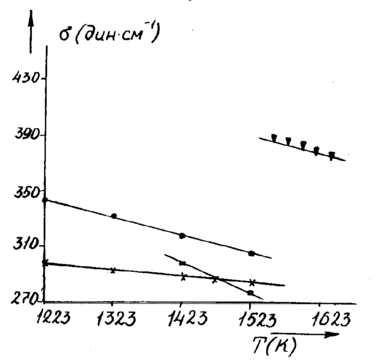Рис. 11.1.2.11. Температурная зависимость поверхностного натяжения растворов состава:(X)- 0,62 ВаО - 0,38 В2О3; (•) – 0,41 ВаО,- 0,41 В2О3 - 0,18 BaF2; (▀) - 0,25 ВаО - 0,41 В2О3- 0,34 BaF2;(▼)- 30°/о Y3Al5O12 в 0,41 ВаО - 0,41 В2О3 - 0,18 BaF2