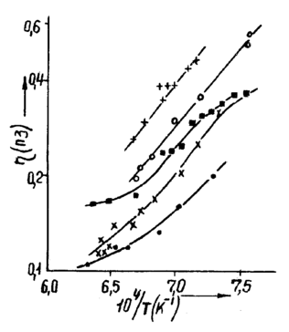 ис. 11.1.2.5. Температурные зависимости вязкости растворителей состава: (+) - ВаB2О4; (o) - 0,62 BaO x 0,38 Ba2О3; (х) - 0,5 BaO x 0,09 BaF2; (▀) - 0,41 BaO x 0,41 Ba2О3 х 0,18 BaF2; (•) – 0,35BaO x 0,41 Ba2О3 x 0,24 BaF2