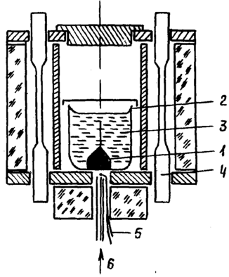ис. 11.1.2.15. Схема кристаллизационной установки для выращивания кристаллов из раствора в расплаве при внешнем инициировании образования зародыша посредством потока холодного газа (аргона): 1 - растущий кристалл; 2 - тигель с крышкой; 3 - раствор; 4 - нагреватель; 5 - термопара; 6 - поток голодного газа