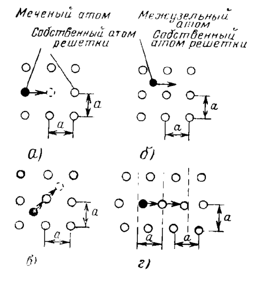 На рис. 11.3.1 с помощью упрощенной плоской кристаллической решетки представлены основные атомные модели диффузии. Существуют различные возможности для перемещения атомов по кристаллу: а) перемещение атомов примеси по вакансиям; б) перемещение атомов по междоузлиям; в) эстафетное перемещение, когда атом примеси вытесняет атом решетки в междоузлие; г) краудионный механизм перемещения, когда междуузельный атом, расположенный посередине между двумя узлами решетки, перемещается к одному из них, смещая одновременно атом, расположенный в узле. Перемещение атомов по вакантному и эстафетному механизмам реализуется обычно в растворах замещения, а в растворах внедрения — по междуузельному механизму.