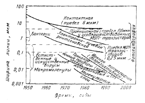 Рис. 11.4.1. Изменение ширины линий элементов ИС по годам при использовании литографических методов изготовления ИС