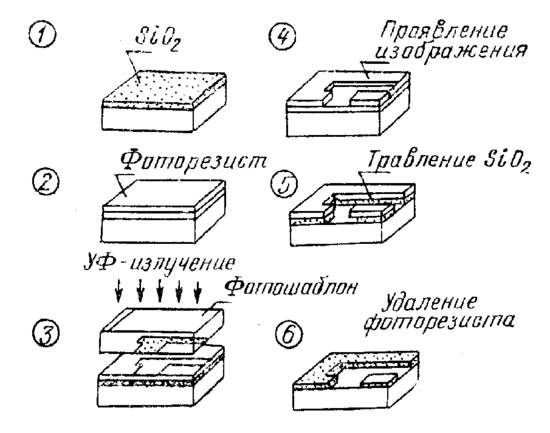 Литографией называется процесс переноса геометрического рисунка шаблона на поверхность кремниевой пластины. Шаблон обычно представляет собой плоскопараллельную стеклянную пластину с нанесенным на нее топологическим рисунком определенного уровня ИС. Применение этого метода позволяет формировать многие схемные элементы, например электроды затвора, металлические соединения, контактные окна, полупроводниковые резисторы, емкости, диоды, транзисторы, колебательные контуры и т.д. Для создания ИС необходимо последовательно перенести на кремниевую пластину топологический рисунок с каждого шаблона.