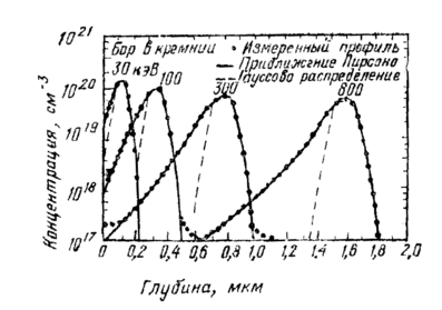 В ряде случаев экспериментальные кривые профиля распределения примеси при ионной имплантации описываются законом распределения, состоящим из двух наложенных гауссовых распределений, каждое из которых имеет свое собственное значение рассеяния Rp1 и Rp2. Более точнoe описание закона распределения требует использования большего числа эмпирических параметров и представляет основной интерес для определения профиля концентрации в технологии ионной имплантации.