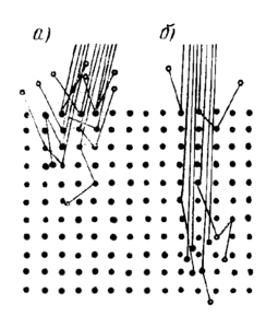 Если пучок падает под несколько отличным от этого направления углом по отношению к кристаллу (рис. 11.5.9,6), то ионы проникают более глубоко в кристалл, проходя между рядами атомов вдоль «каналов», претерпевая с ними слабые скользящие столкновения.