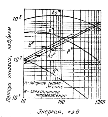 де К — коэффициент пропорциональности. Для некоторых используемых при ионной имплантации ионов на рис. 11.5.4 представлены расчетные зависимости потерь энергии, обусловленные ядерным и электронным торможением.