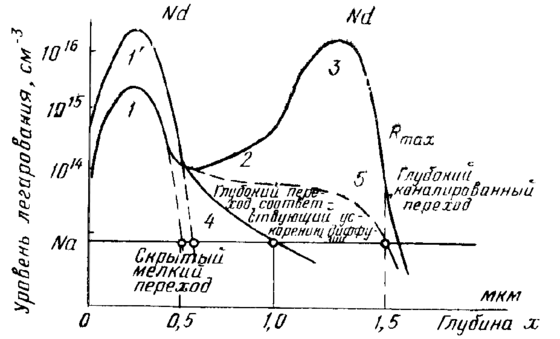 Следует отметить, что при некоторой энергии бомбардирующих ионов, называемой критической, происходит переход монокристаллической пластины в аморфное состояние, что и определяет основную сложность получения легированных слоев глубиной более 1мкм. Увеличить глубину легирования при необходимости можно методом высокотемпературной диффузии. Диффузия имплантированных примесей протекает в условиях наличия помимо обычных дефектов комплексов вакансий и линейных дефектов, которые действуют в качестве стоков примесных частиц.