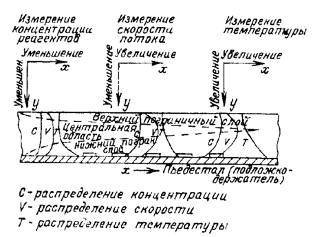 Как видно из этого рисунка в реакторе в различных его точках существуют резко отличающиеся условия. Вблизи стенок образуются пограничные области, в которых скорости потоков, температура, концентрация реагентов могут значительно отличаться от величин, характерных для входящего потока смеси. Изучая кинетику нанесения пленок, мы должны рассмотреть процессы переноса реагентов через пограничные смеси к подложке и отвод от нее продуктов реакций.