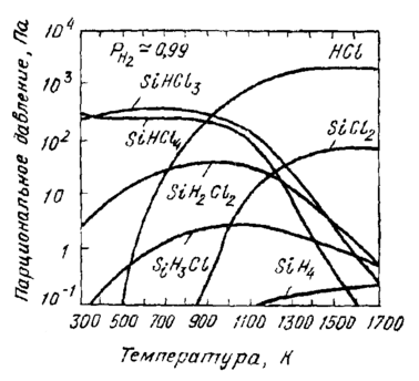 Согласно положениям о химическом равновесии, при избытке водорода первая реакция идет с образованием кремния, а при подаче в систему соляной кислоты НСl можно осуществить газовое травление кремниевой подложки. Поясним это более подробно. Как уже говорилось, первая реакция является обобщающей. В действительности в системе протекают, как минимум, следующие реакции: