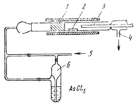 Рис. 11.6.14. Схема установки для получения эпитаксиальных пленок GaAs в системе Ga—AsCl3—H2: 1— зона мышьяка 425° С; 2 — лодочка с галлием 800° С; 3 — держатель с подложкой 750 или 900° С; 4 — выход водорода с продуктами реакции; 5 — вход чистого водорода; 6 — барботер с AsCl3