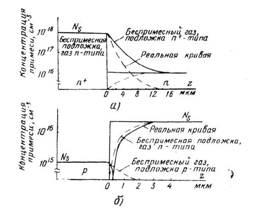 Рис. 11.6.12. Влияние автолегирования на аспределение примеси в эпитаксиальных слоях: а—п. на n+; б—п на р