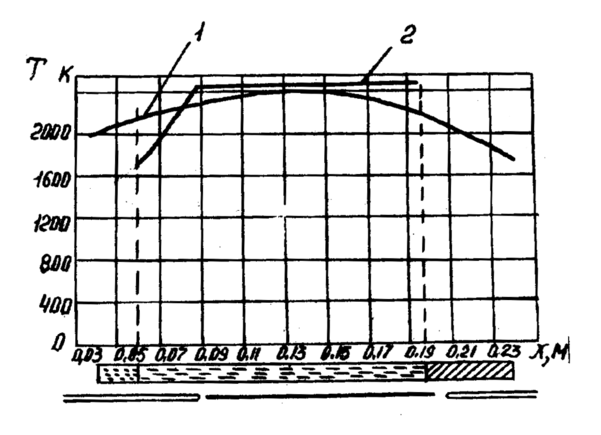 ис. 11.1.9 Распределение температуры: 2 - на нагревателе; 2 - в расплаве
