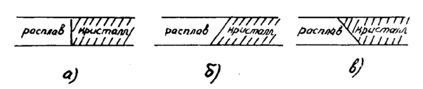 ис. 11.1.10. Возможные расположения фронта кристаллизации относительно дна контейнера: а - вертикальное; б, в - наклонное расположение