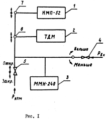 - поверяемые напоромеры 1 и 2 (1 - напоромер типа HMП-52, пределы измерения 0 + 10 кПа, класс точности 2,5; 2 - напоромер типа ТДМ, пределы измерения 0 + 16 кПа, класс точности 4);