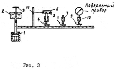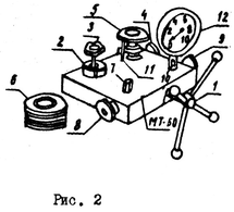 становка для поверки пружинного манометра (рис, 2 и 3) представлена поршневым манометром типа МТ-60, где 1 - маховик поршня для создания давления в гидросистеме установки; 2 - маслобак для заполнения гидросистемы установки маслом; 3 - вентиль маслобака;