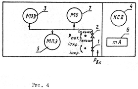 - поверяемый измерительный комплект, состоящий из бесшкального преобразователя давления 5 типа МПЭ и вторичного прибора миллиамперметра 6 (МПЭ - МИ, пределы измерений 0 + 0,1 МПа, выходной токовый сигнал 0+ 5 мА, класс точности 1, миллиамперметр - пределы измерения 0+5 мА, класс точности 1) ;