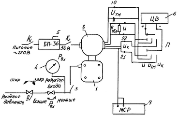 Схема установки, используемой для снятия характеристик измерительных преобразователей "Сапфир-22", представлена на рис.1. Давление воздуха Pвх, подаваемое в преобразователь 1, поступает от компрессора при открытых кране 2 и пневмотумблере 3. Требуемое значение давления Pвх