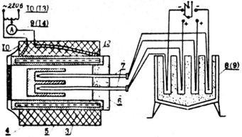 4.3. Схема установки ТЭП в электрической печи изображена на рис. 3. Трубчатая электрическая печь 10 имеет нихромовый нагреватель 12, который намотан на фарфоровую трубу 3. Для уменьшения тепловых потерь и выравнивания температурного поля по длине трубы она помещена в кожух 4 , заполненный теплоизолирующим материалом 5, и с торцов закрыта асбестом 6. Рабочие концы TЭП вставлены в металлический блок 7, помещенный в фарфоровую трубу на 2/3 ее длины. Металлический блок обеспечивает равенство температур рабочих концов обоих ТЭП. Для предохранения рабочего конца платинородий-платинового ТЭП от соприкосновения с металлическими предметами он заключен в тонкостенный фарфоровый колпачок. Свободные концы ТЭП в защитных трубках находятся в термостате 8 (9), заполненном смесью тающего льда с водой, благодаря чему температура свободных концов ТЭП имеет постоянное значение 0°С. Температура печи устанавливается в зависимости от силы тока в цепи нагревателя. Контроль за силой тока осуществляется по показанию амперметра 9 (14). Регулировка тока производится при помощи автотрансформатора 10 (13). Термс-ЭДС преобразователей измеряется при помощи цифрового милливольтметра (13). В скобках указаны обозначения позиций на рис. 1.