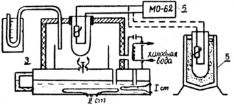 Сопротивление термопреобразолателя при температуре насыщенного пара ( Rс ) определяют в водяном кипятильнике 3. Нижняя часть кипятильника на 2/3 наполнена дистиллированной водой. С помощью электрического нагревателя вода нагревается до кипения. Образовавшийся пар заполняет верхнюю часть кипятильника-термостат, затем проходит в холодильник, где конденсируется. После этого конденсат стекает в нижнюю часть кипятильника.