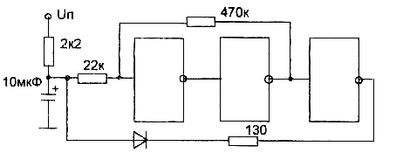 Исследовать зависимость частоты мультивибратора от отношения номиналов резисторов, обозначенных на схеме как 470к (R2) и 22к (R1).